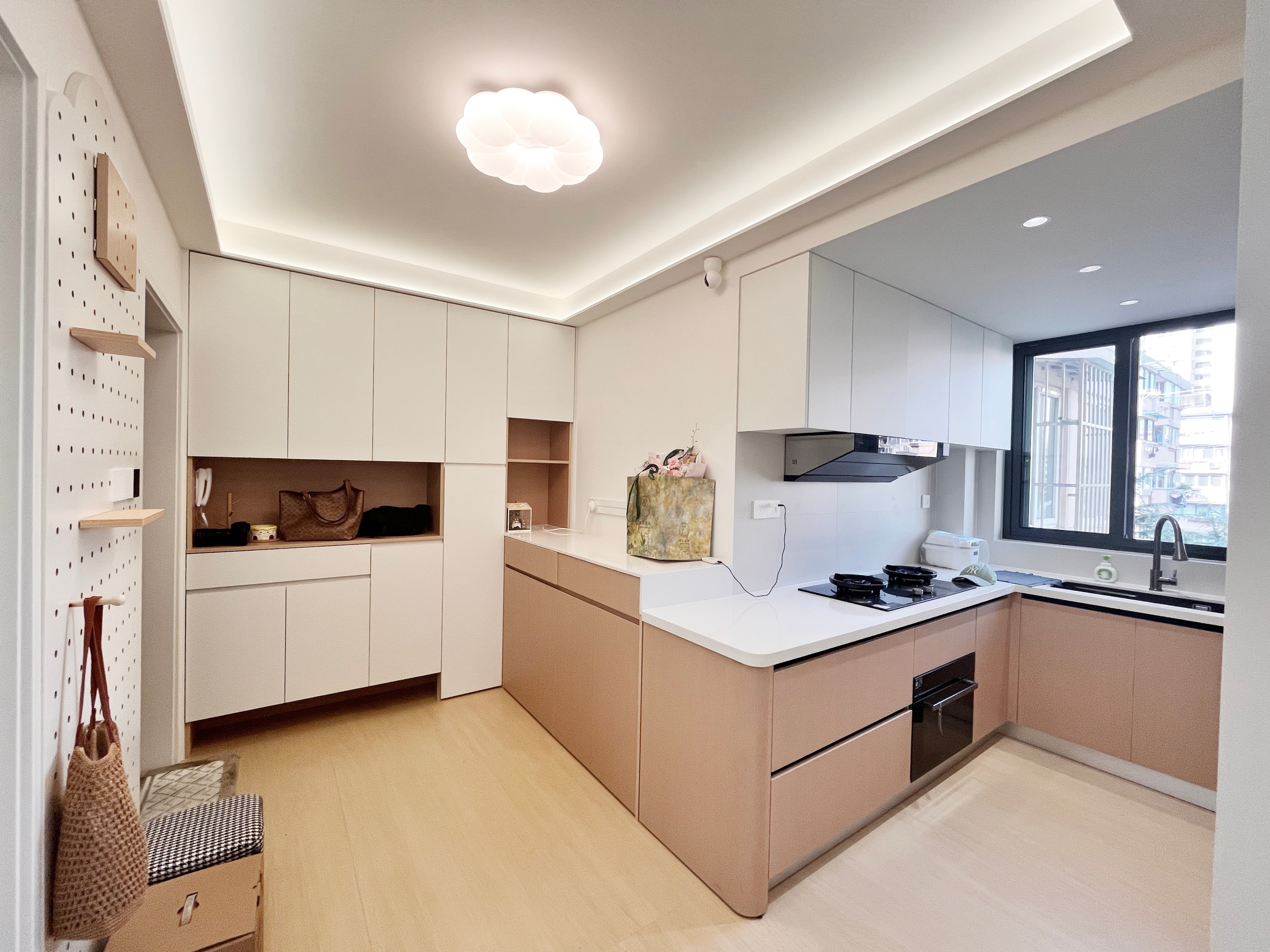 45㎡的两室户老房,无客餐厅,一条狭窄走道连通厨卫和两间卧室,通风采光不佳。王先生想要给喜爱星星人和LABUBU的未婚妻一个有爱的小家,他与同样喜欢潮玩的设计师马健丽一拍即合,通过全屋定制,打造出一个通透实用、兼顾萌宠与收藏的奶油风婚房