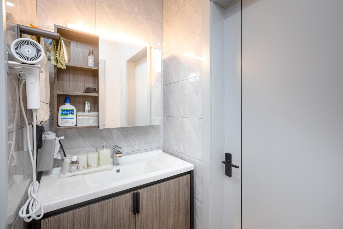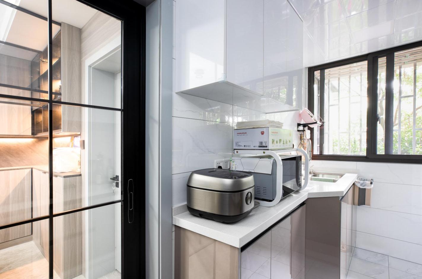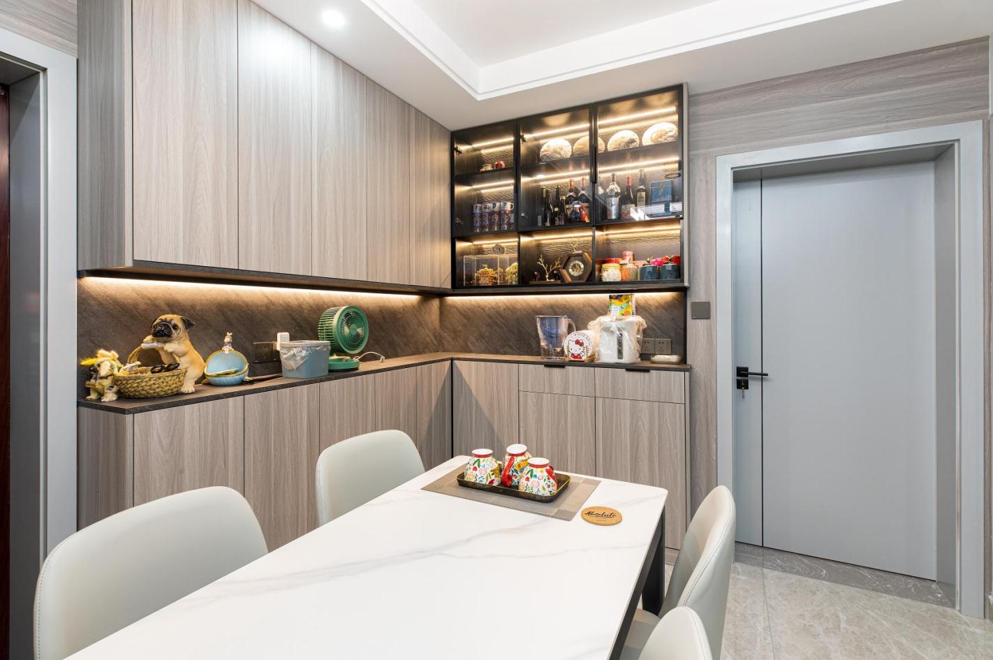 除却随处可见的采光设计,可以让自然光不受限制地引入,灯光也是空间里不可或缺的部分。 挑空处精心设置的吊灯,犹如皎洁的明月,含蓄、巧妙地为空间褪去冰冷外衣