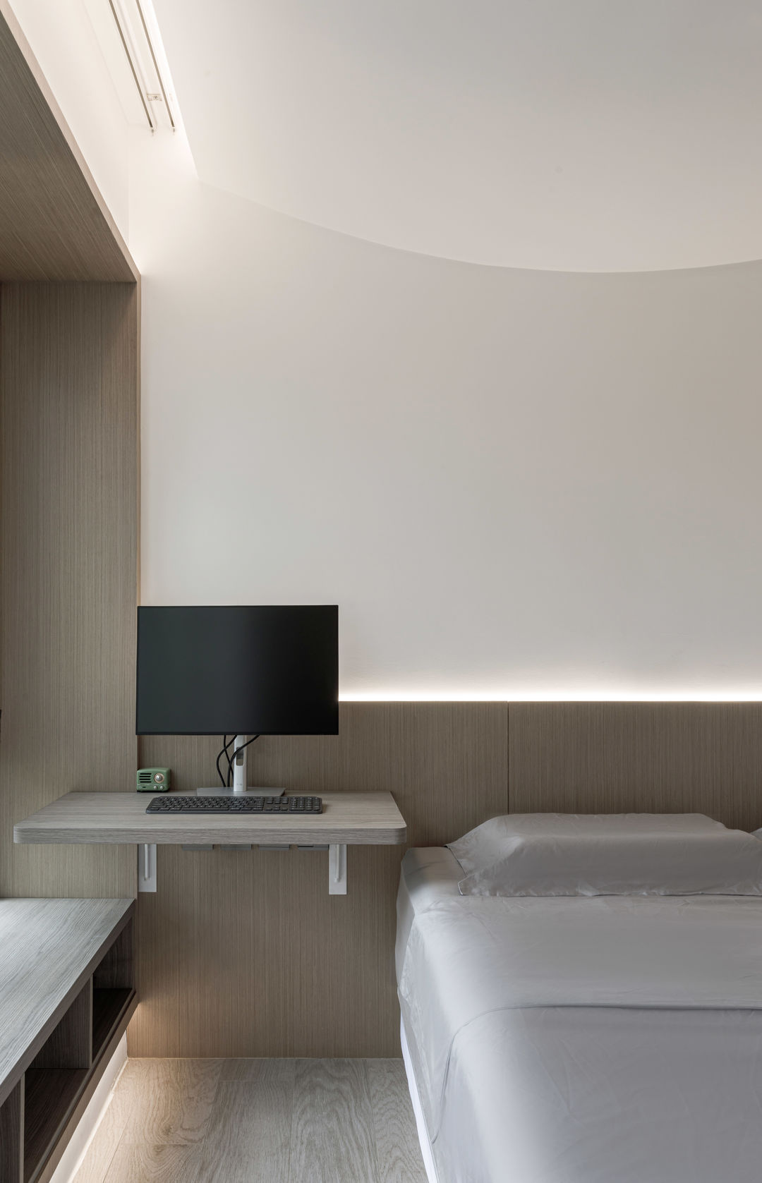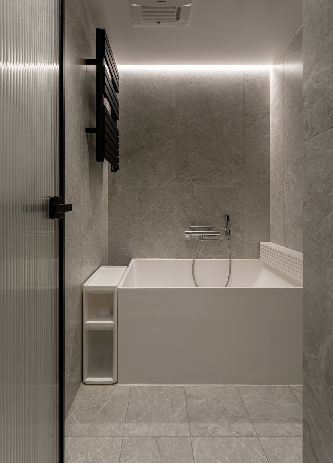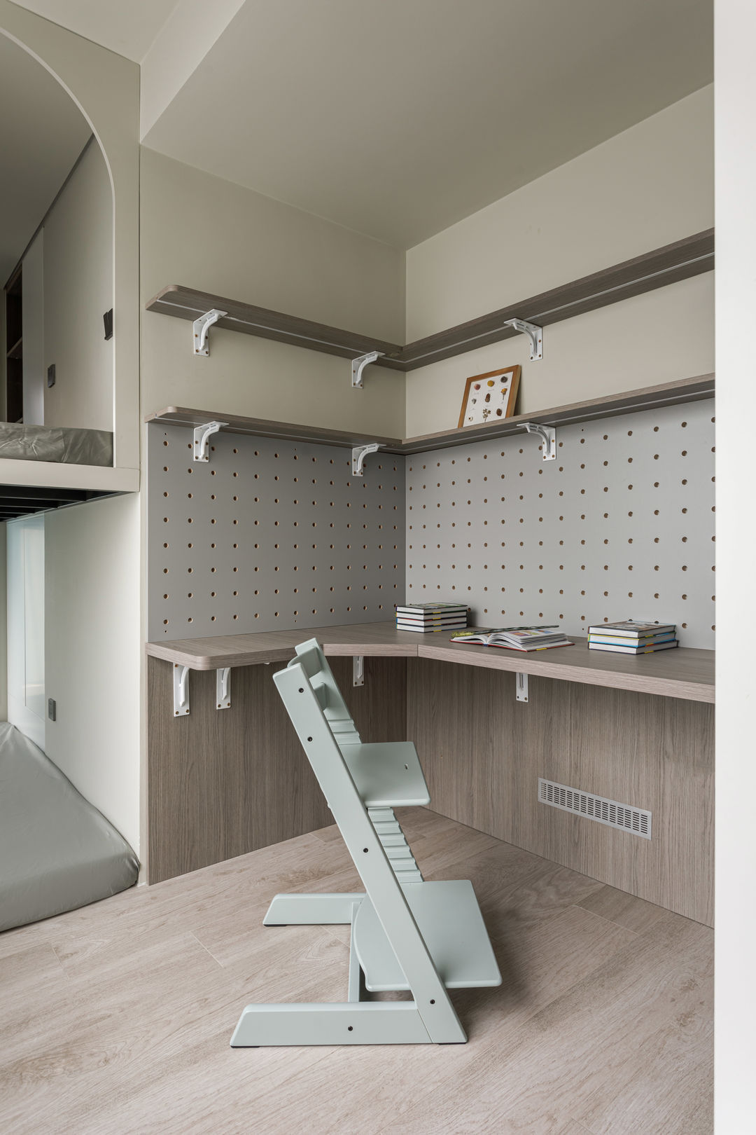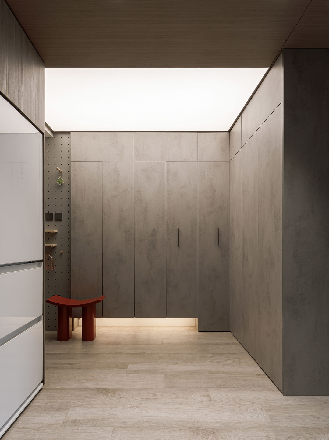 根据落地问题进行分析后,制定以下解决方案:绿色管道连接物业管道井内水冷空调,儿童房完全被巨梁隔断,进深无法安放室内机,通过与主卧空调共享风机解决制冷问题。红色管道代表新风,用地送风的形式避开主梁,主竖管连接的送风管道隐藏在儿童房收纳柜内。地新风,地暖管道,水电管道,主排污管道位移都同层铺设,避免任何交叉,解决层高问题。