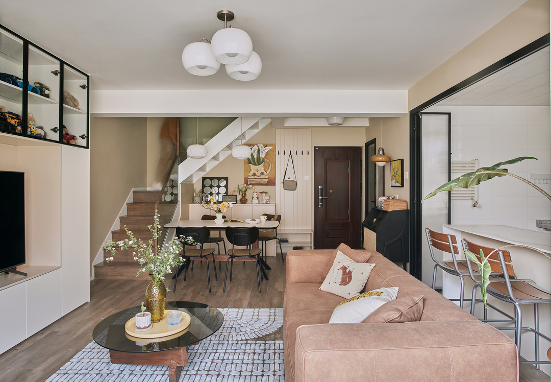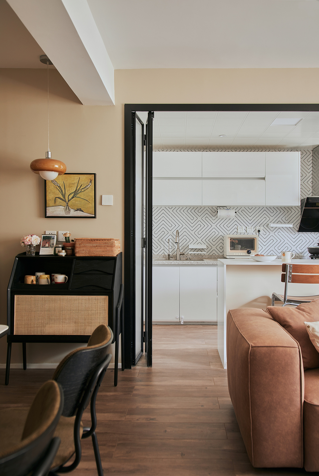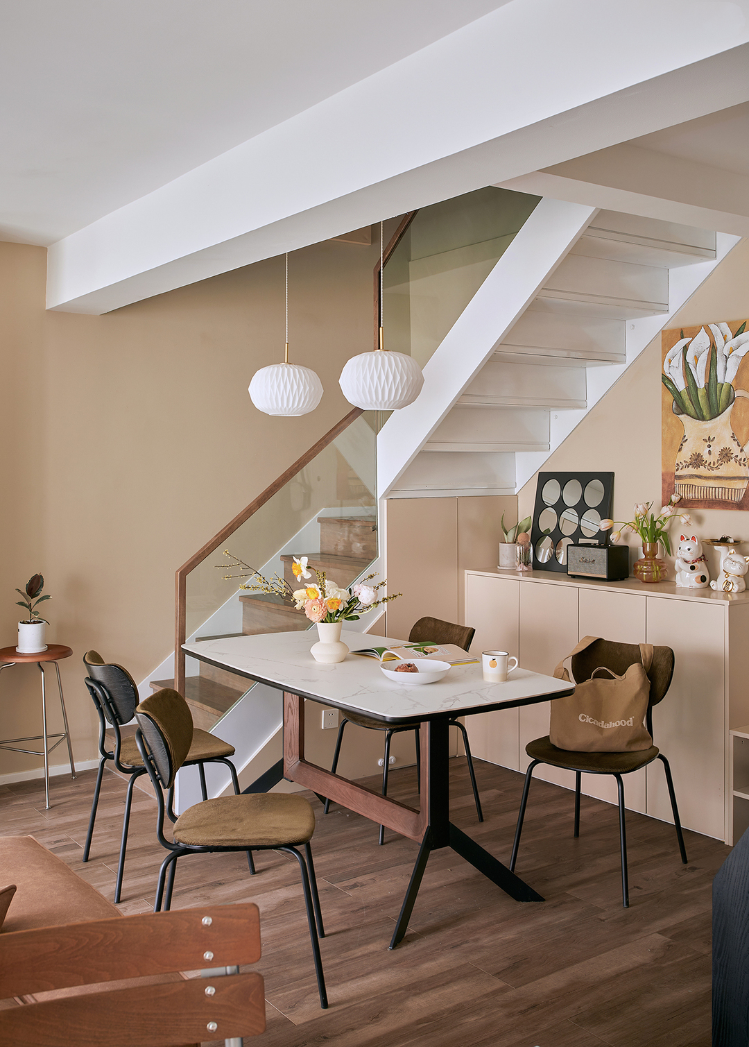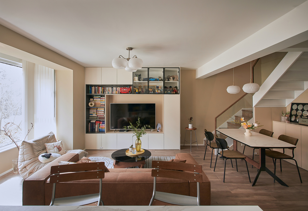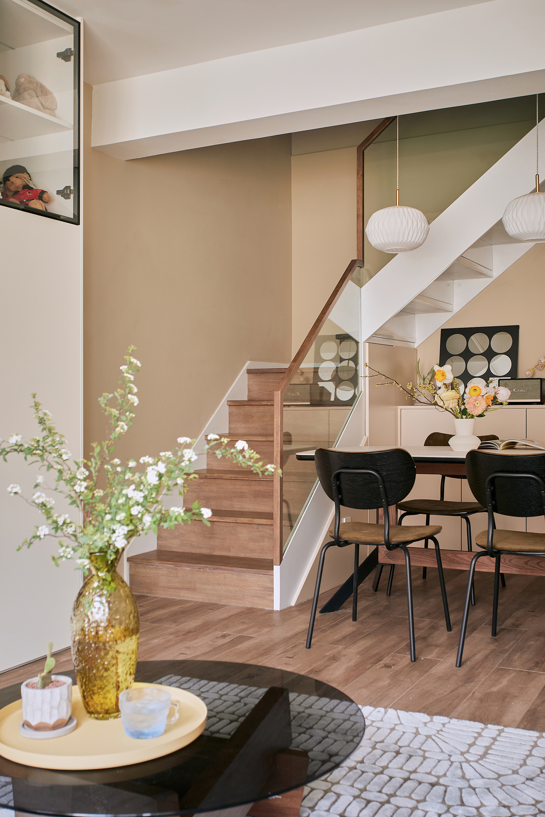 ▪ 改造重点: 1. 入户及楼梯下方空间改为玄关、餐厅、储物功能三合一; 2. 利用电视背景做整墙收纳柜,实用又美观; 3. 将原厨房半墙玻璃改为折叠窗,客厨之间可自由切换开合模式; 4. 改变二楼所有门洞位置,增设次卧、主卫改为三分离式,并在楼梯处增设独立洗衣区。