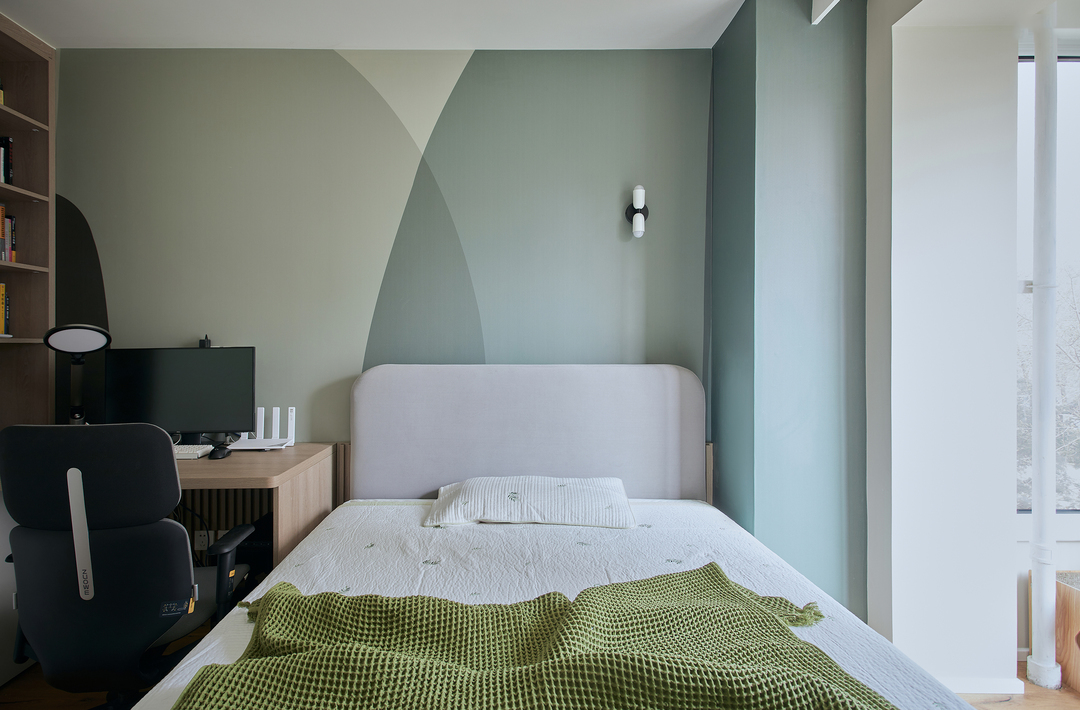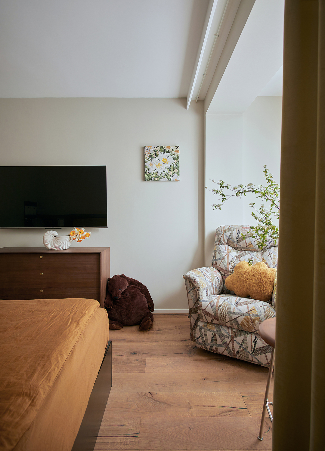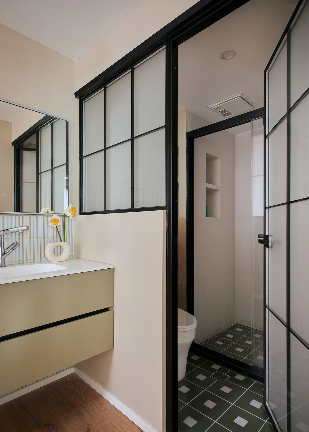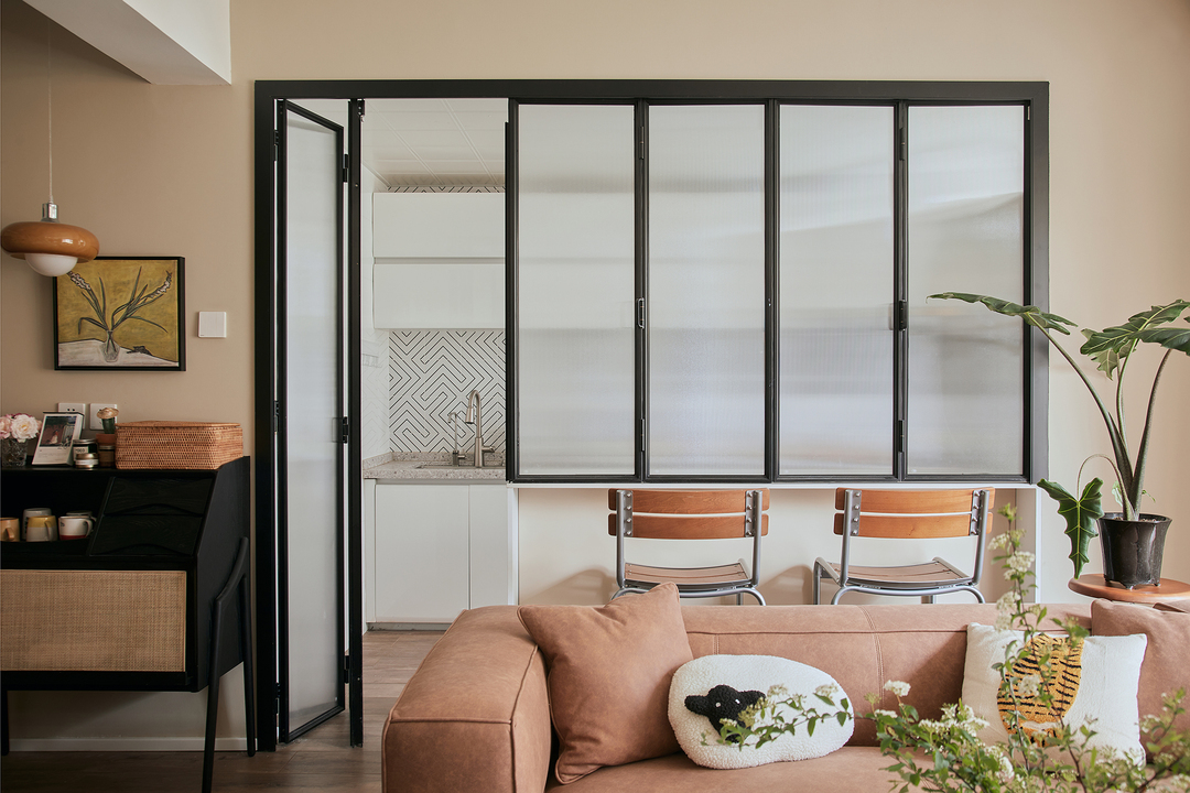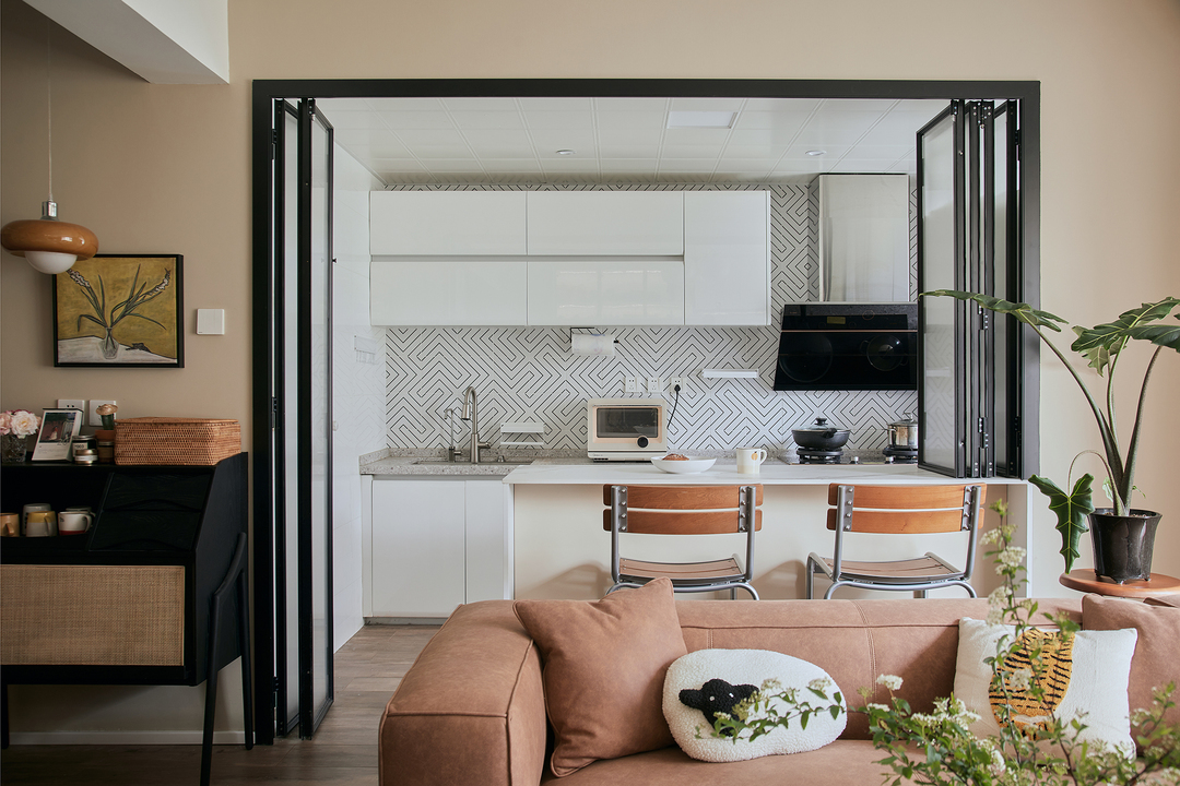 ▪ 改造重点: 1. 入户及楼梯下方空间改为玄关、餐厅、储物功能三合一; 2. 利用电视背景做整墙收纳柜,实用又美观; 3. 将原厨房半墙玻璃改为折叠窗,客厨之间可自由切换开合模式; 4. 改变二楼所有门洞位置,增设次卧、主卫改为三分离式,并在楼梯处增设独立洗衣区。