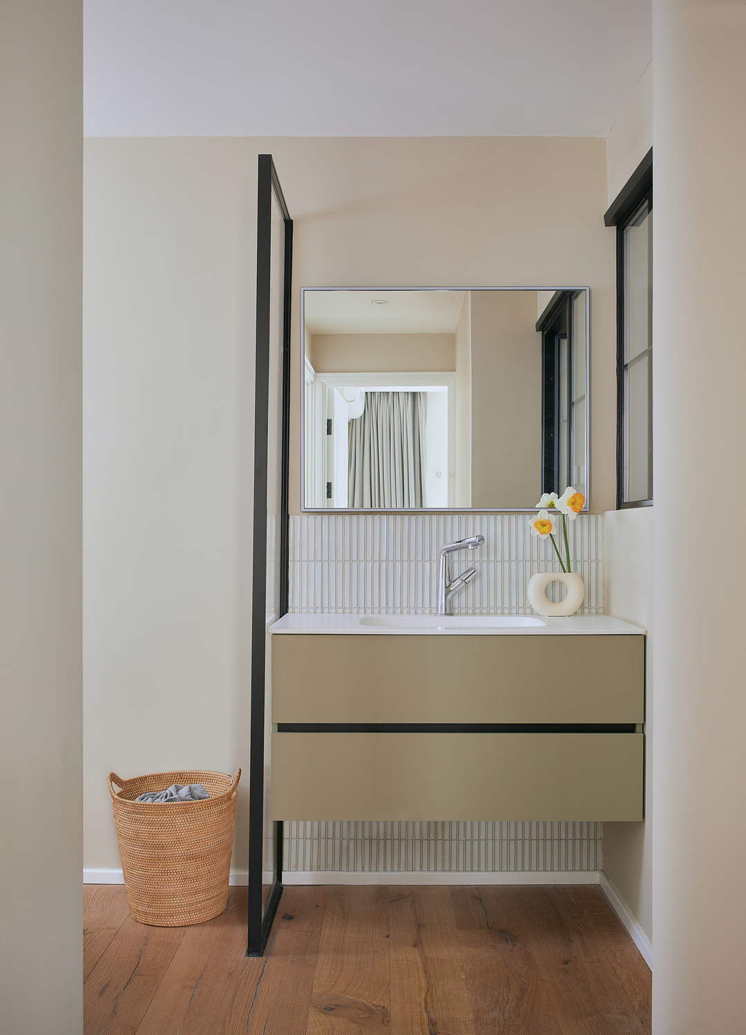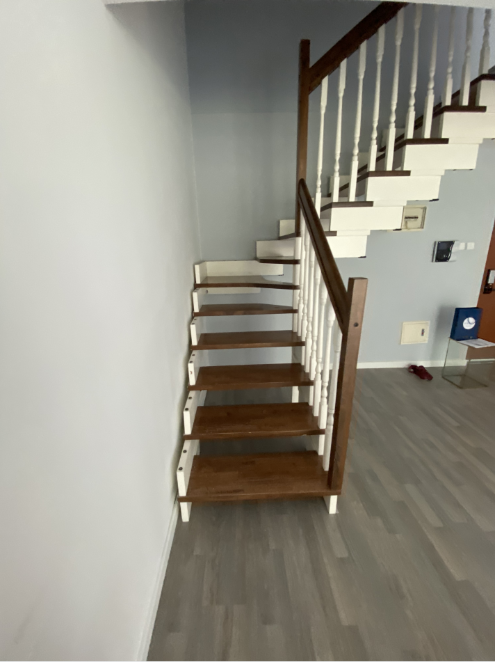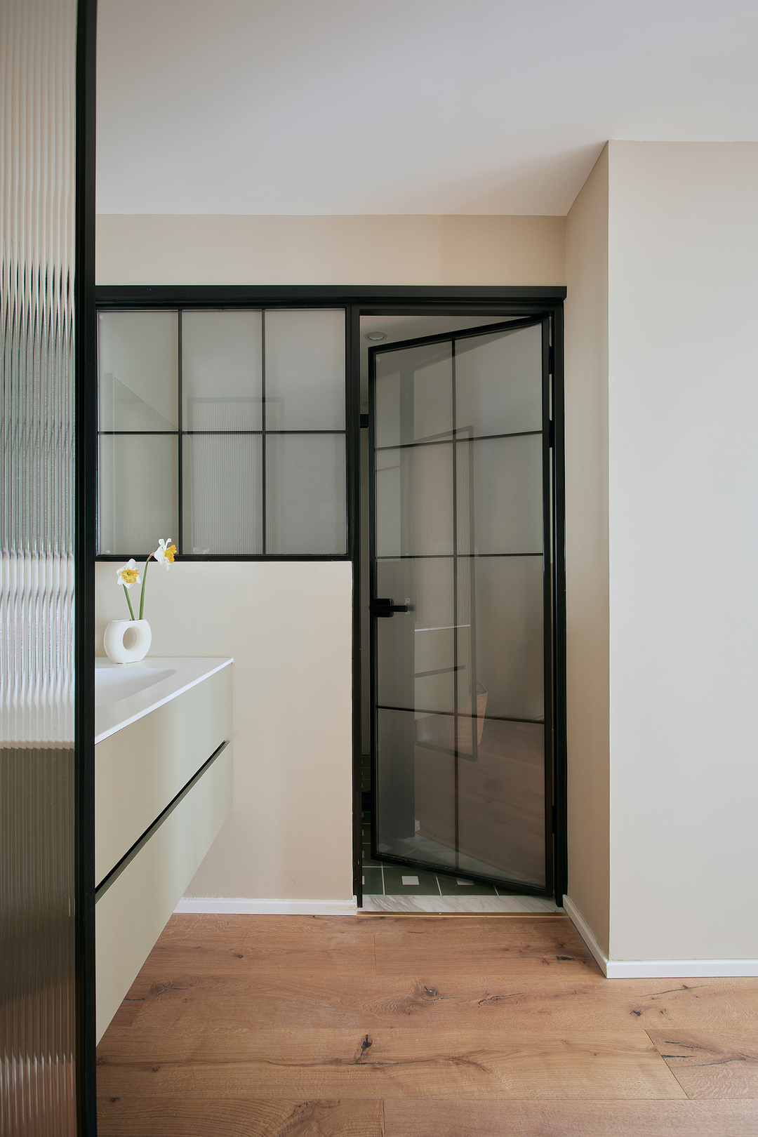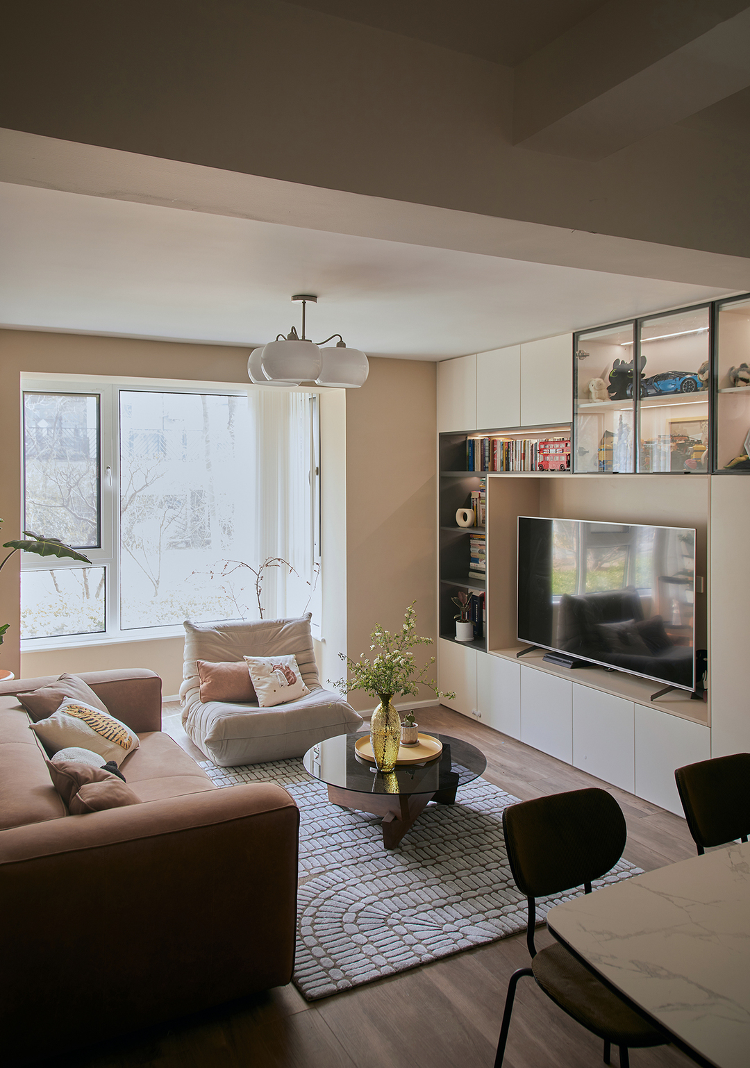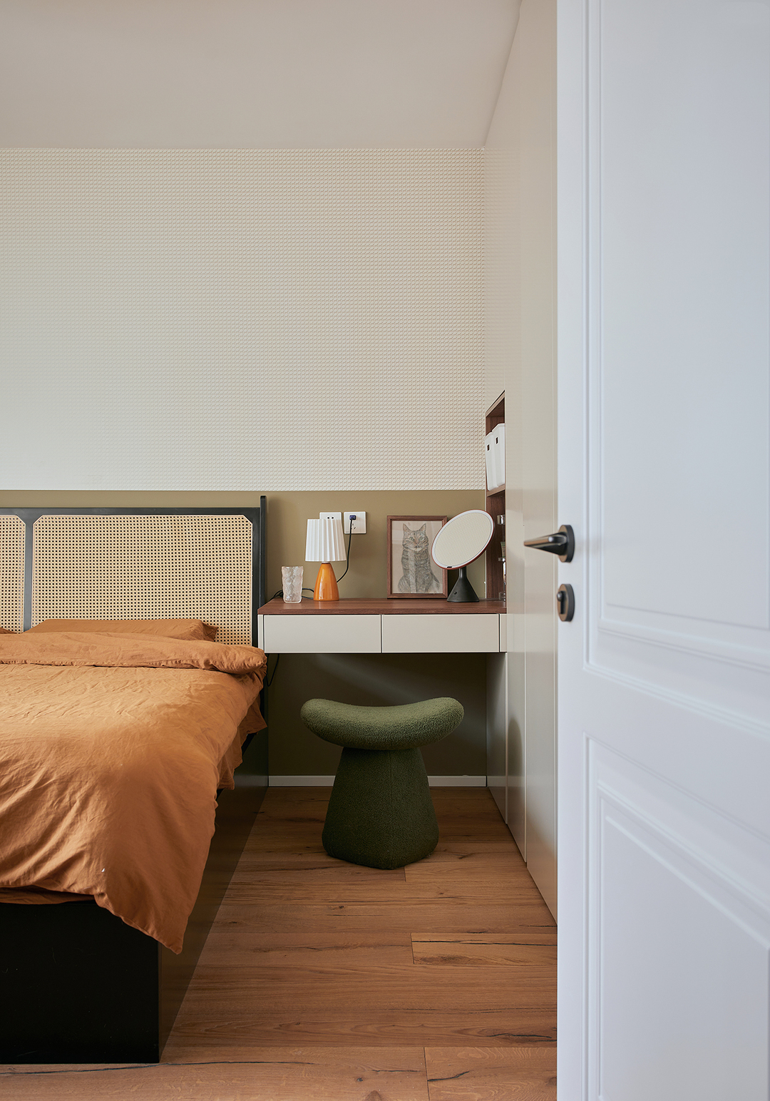 ▪ 改造重点: 1. 入户及楼梯下方空间改为玄关、餐厅、储物功能三合一; 2. 利用电视背景做整墙收纳柜,实用又美观; 3. 将原厨房半墙玻璃改为折叠窗,客厨之间可自由切换开合模式; 4. 改变二楼所有门洞位置,增设次卧、主卫改为三分离式,并在楼梯处增设独立洗衣区。