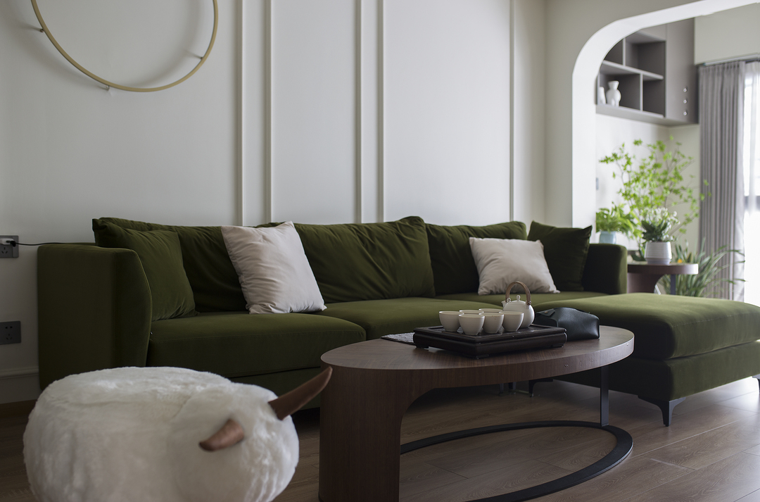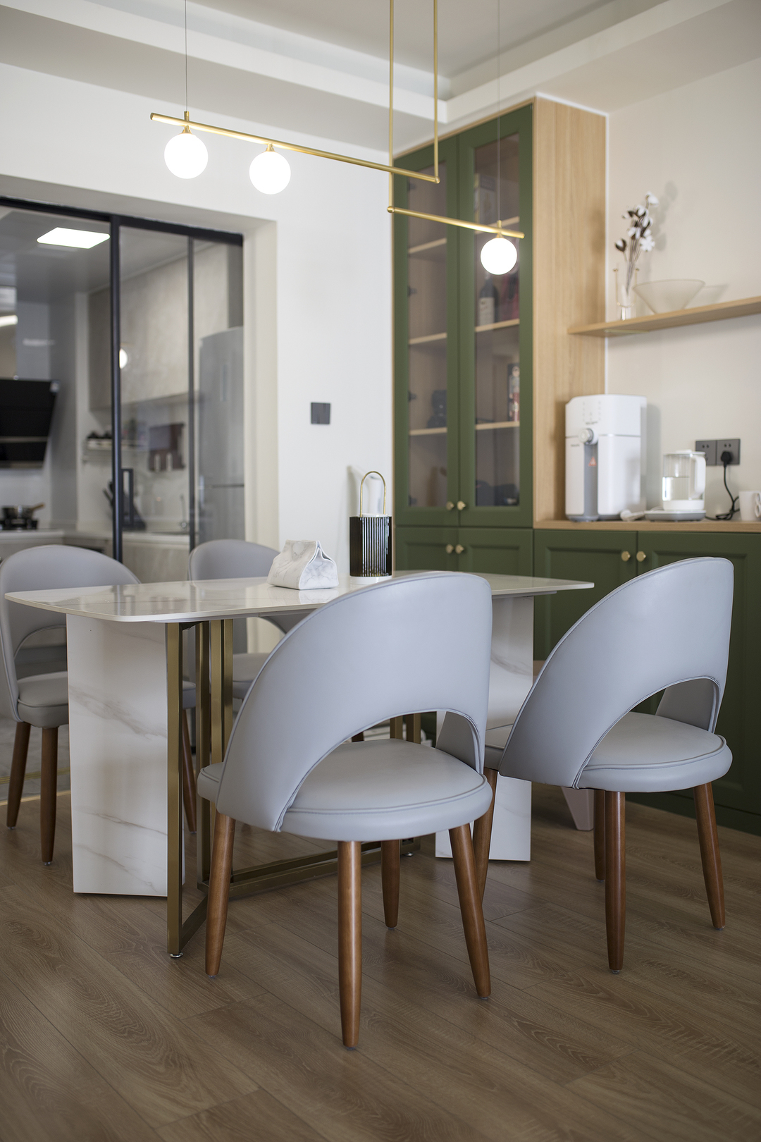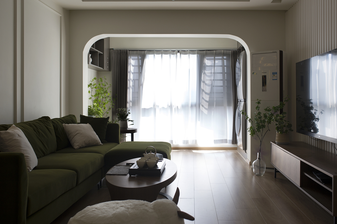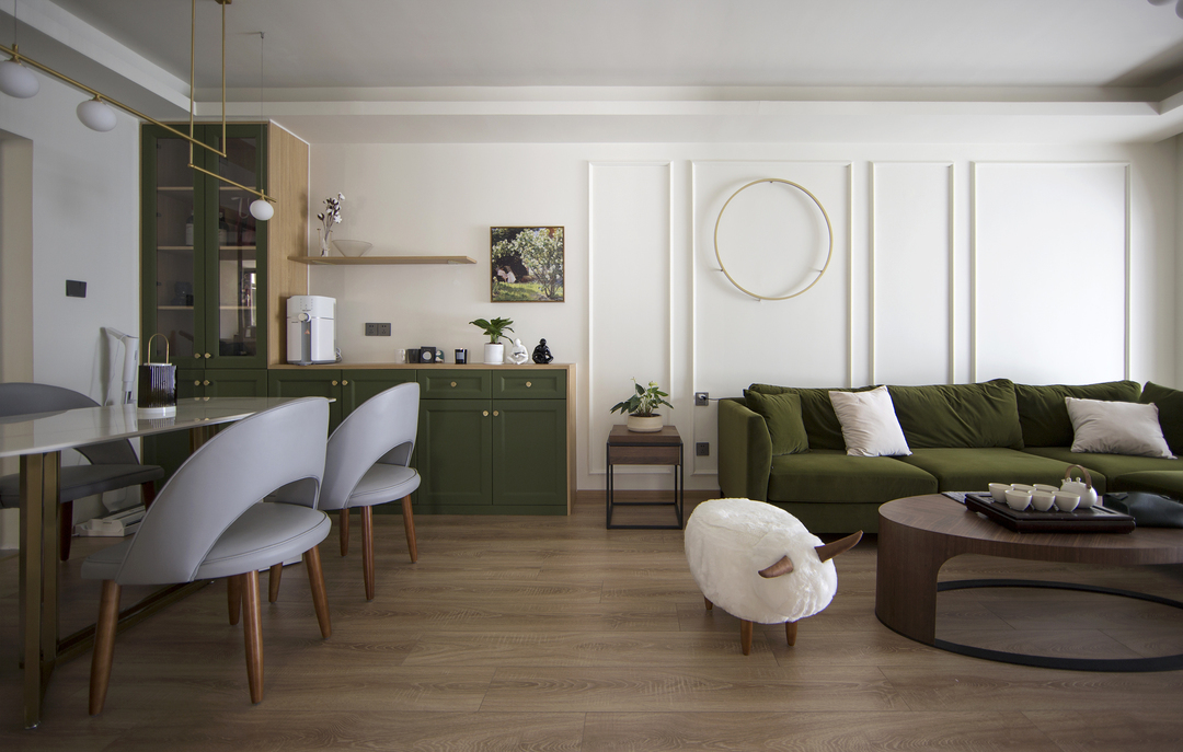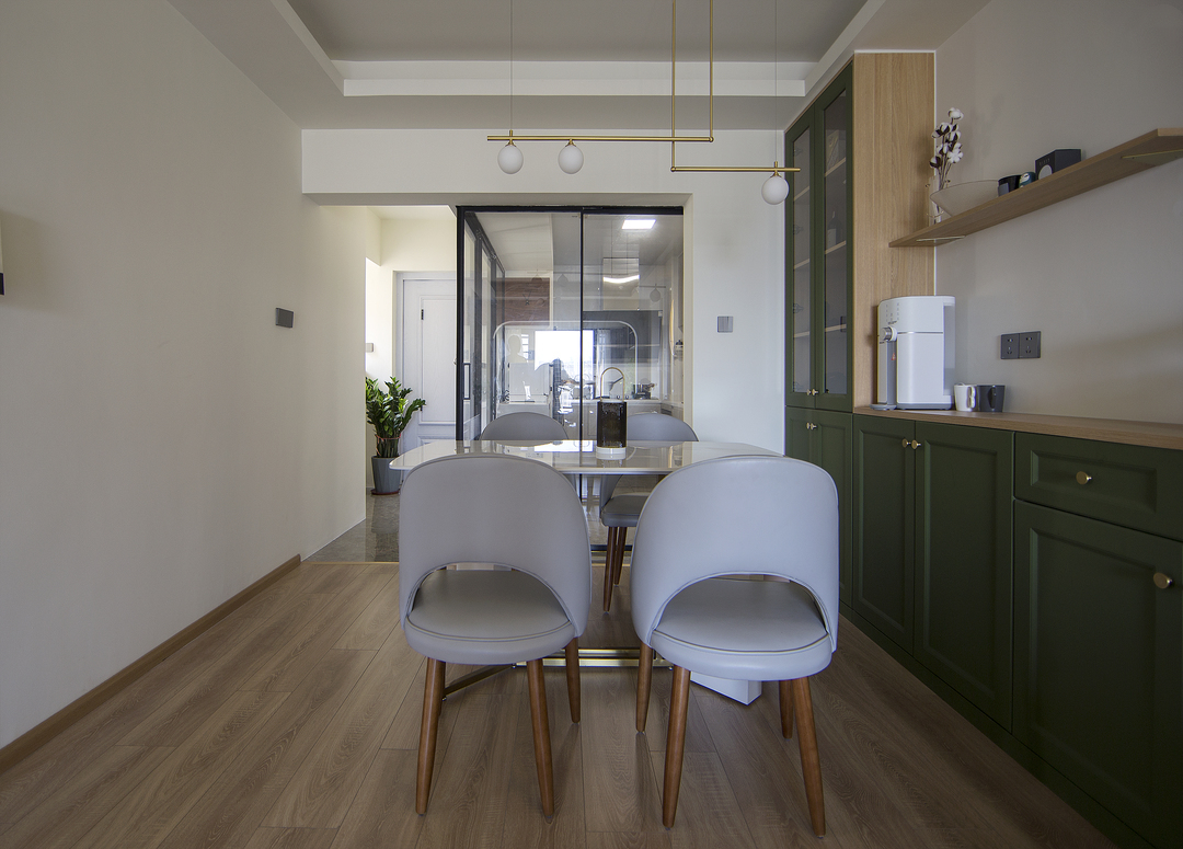 ①厨房间隔墙体拆除后,占用一部分原有过道的位置,厨房的橱柜做L形,让厨房的操作台和空间收纳提升。同时用L形的玻璃推拉门隔断厨房,一侧的推拉门可完全推入墙内,厨房可开放也可以封闭。②将两个次卧以及间隔卫生间的墙体拆除,重新分割了空间。增加了卫生间的空间,将卫生间一分为二,独立分割出一个带蹲便器和小洗手台的空间。③阳台封窗和客厅连通,增大客厅视野。