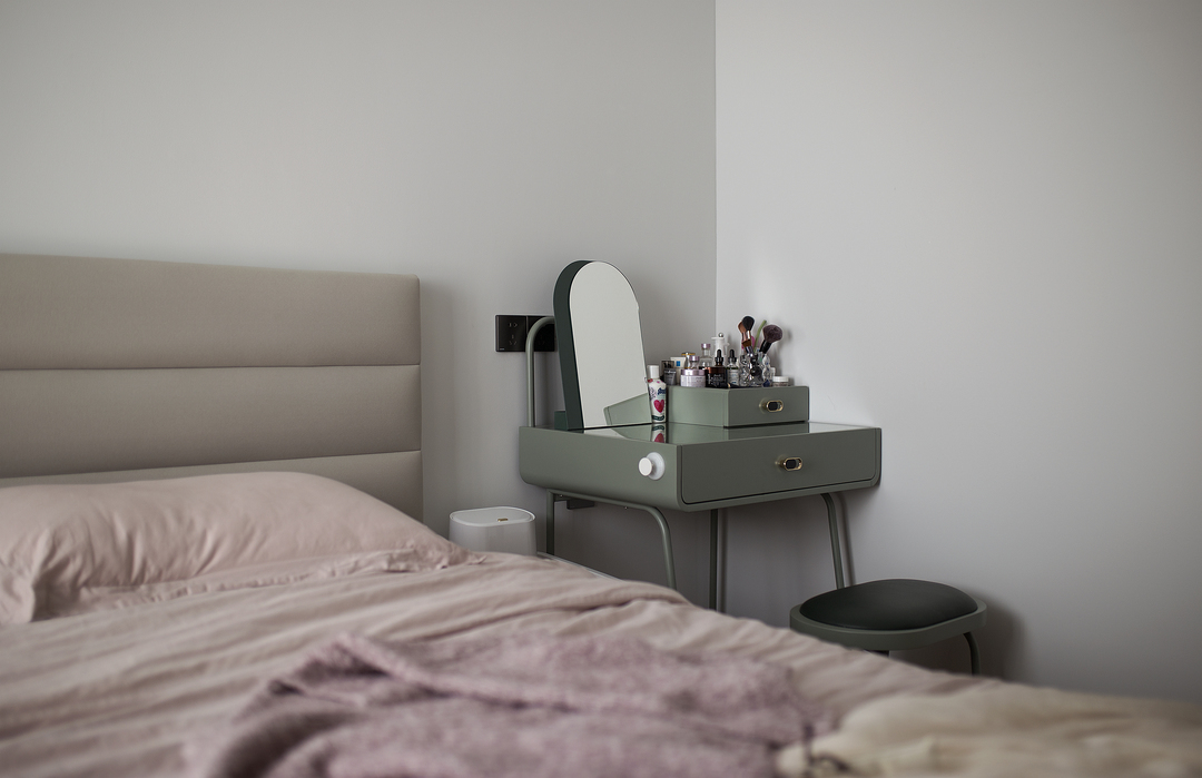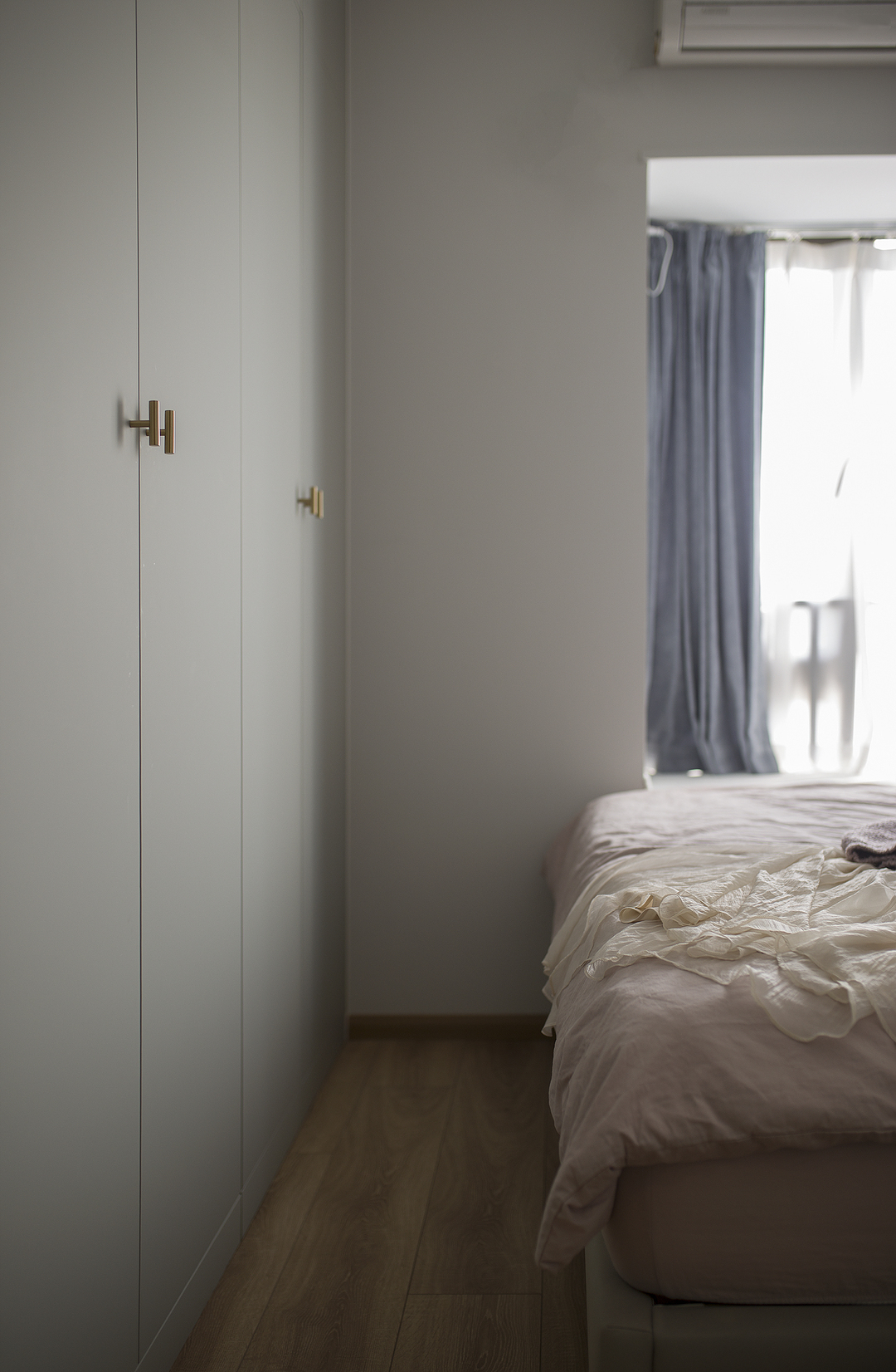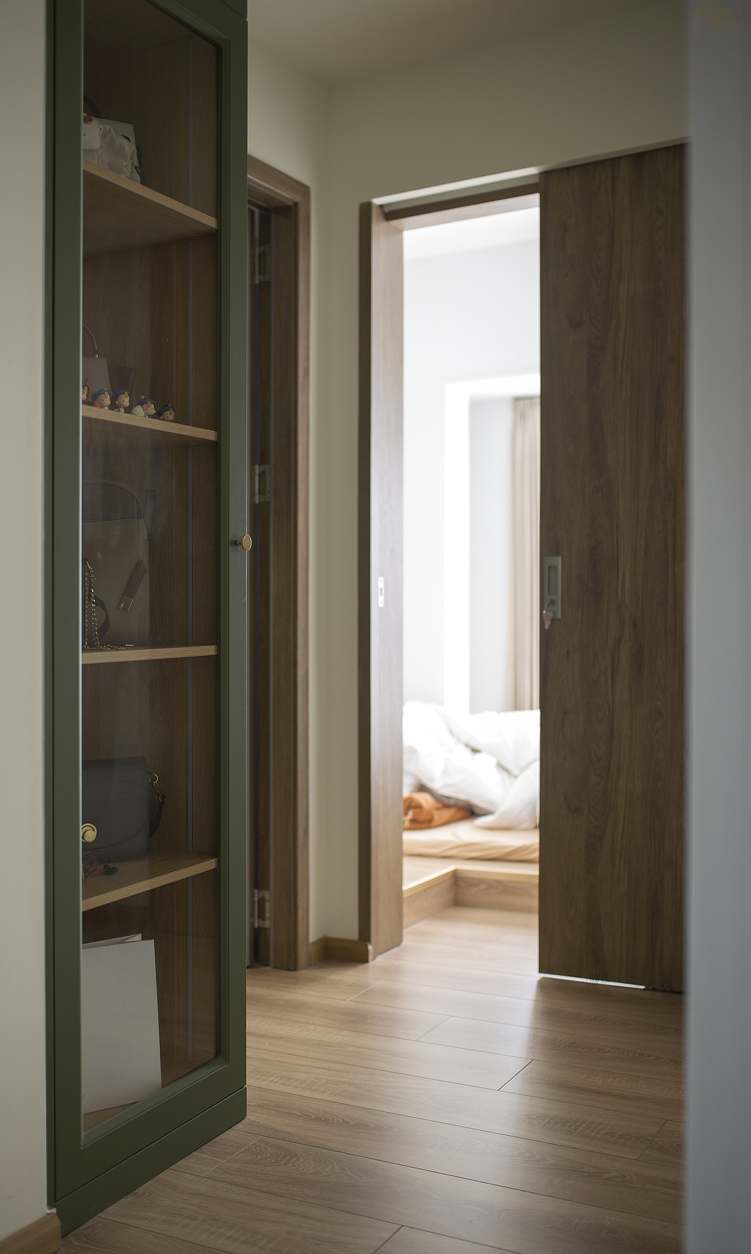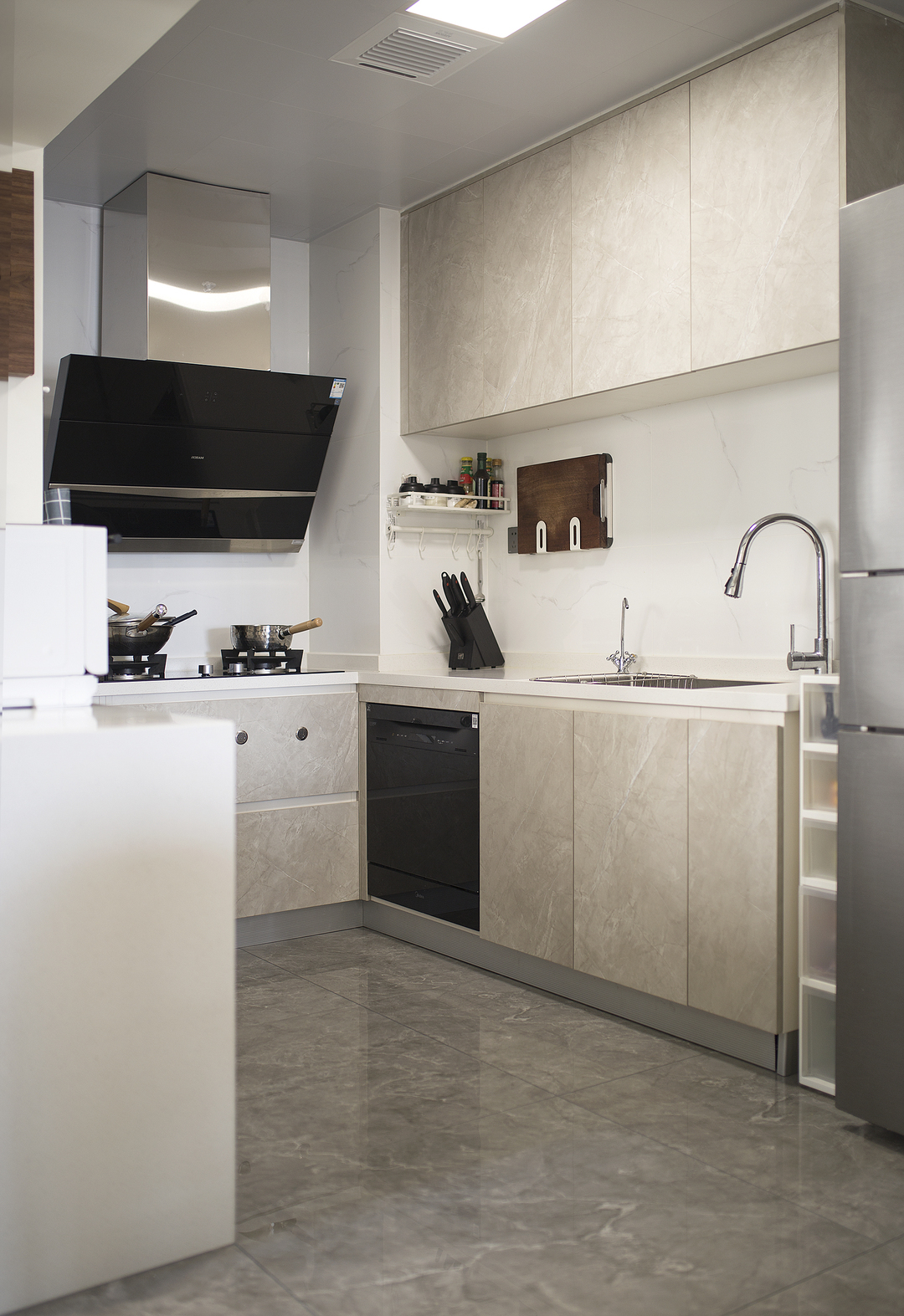 ①厨房间隔墙体拆除后,占用一部分原有过道的位置,厨房的橱柜做L形,让厨房的操作台和空间收纳提升。同时用L形的玻璃推拉门隔断厨房,一侧的推拉门可完全推入墙内,厨房可开放也可以封闭。②将两个次卧以及间隔卫生间的墙体拆除,重新分割了空间。增加了卫生间的空间,将卫生间一分为二,独立分割出一个带蹲便器和小洗手台的空间。③阳台封窗和客厅连通,增大客厅视野。