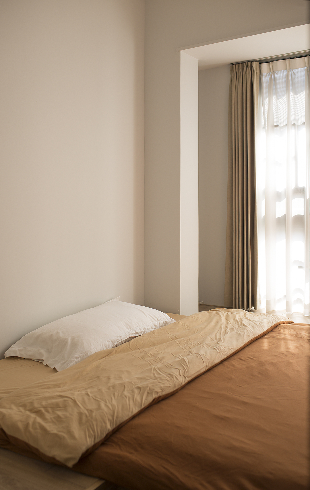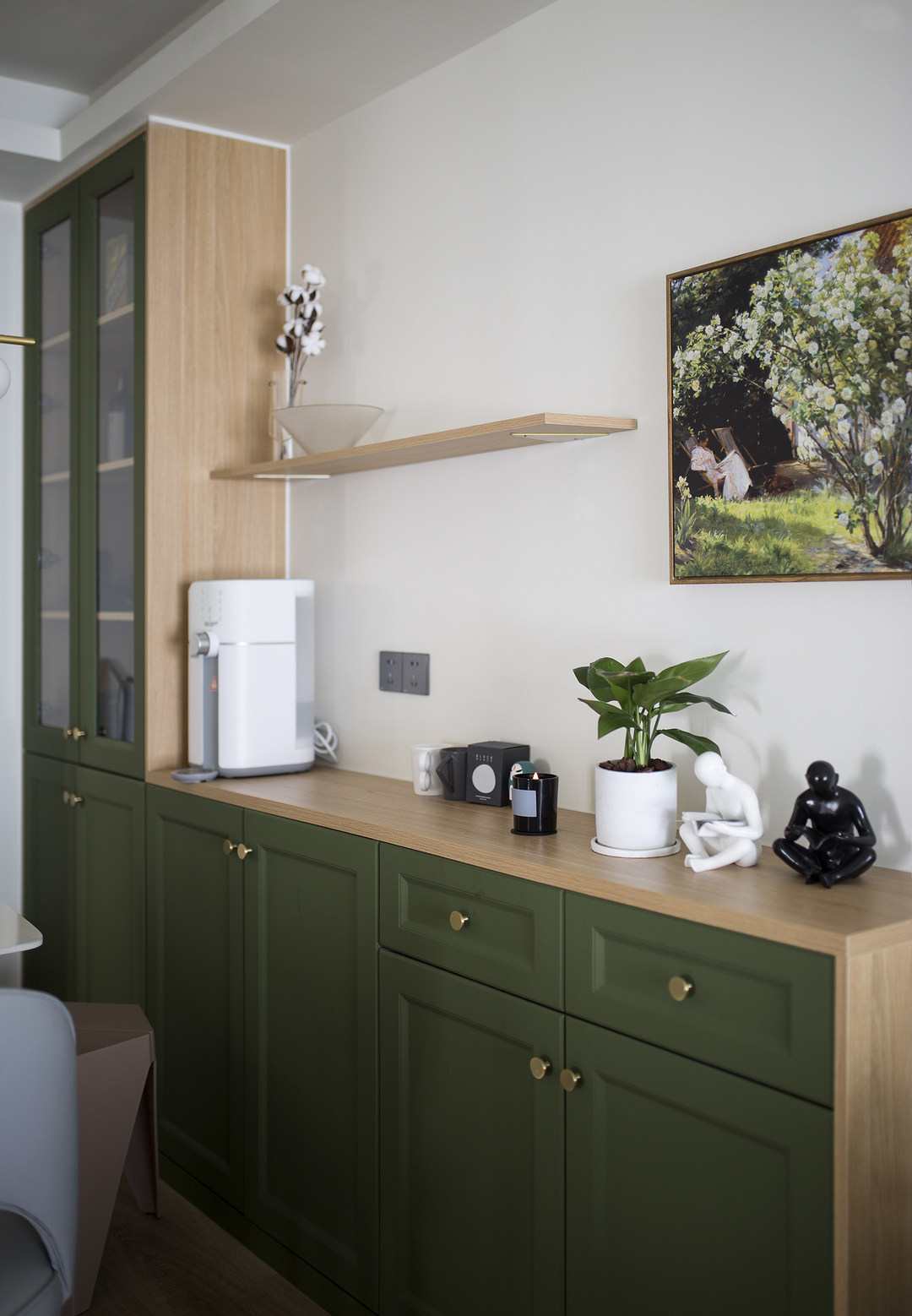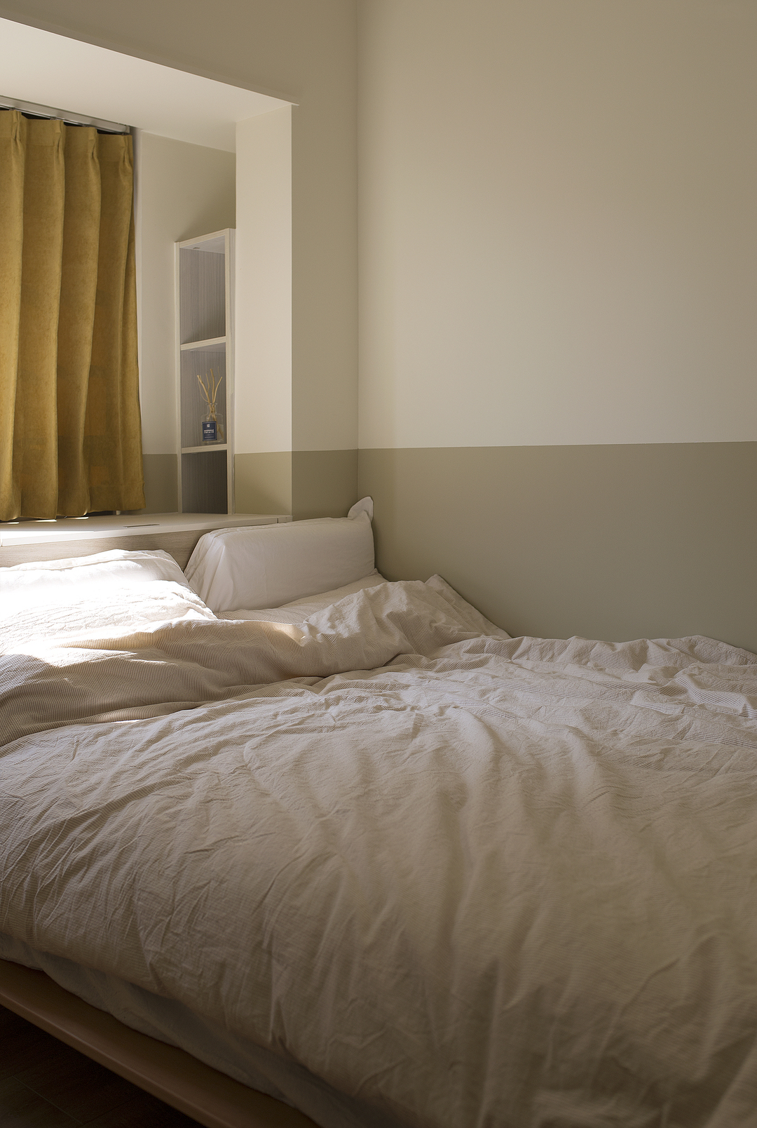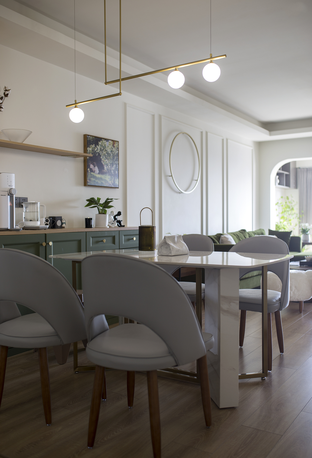 ①厨房间隔墙体拆除后,占用一部分原有过道的位置,厨房的橱柜做L形,让厨房的操作台和空间收纳提升。同时用L形的玻璃推拉门隔断厨房,一侧的推拉门可完全推入墙内,厨房可开放也可以封闭。②将两个次卧以及间隔卫生间的墙体拆除,重新分割了空间。增加了卫生间的空间,将卫生间一分为二,独立分割出一个带蹲便器和小洗手台的空间。③阳台封窗和客厅连通,增大客厅视野。
