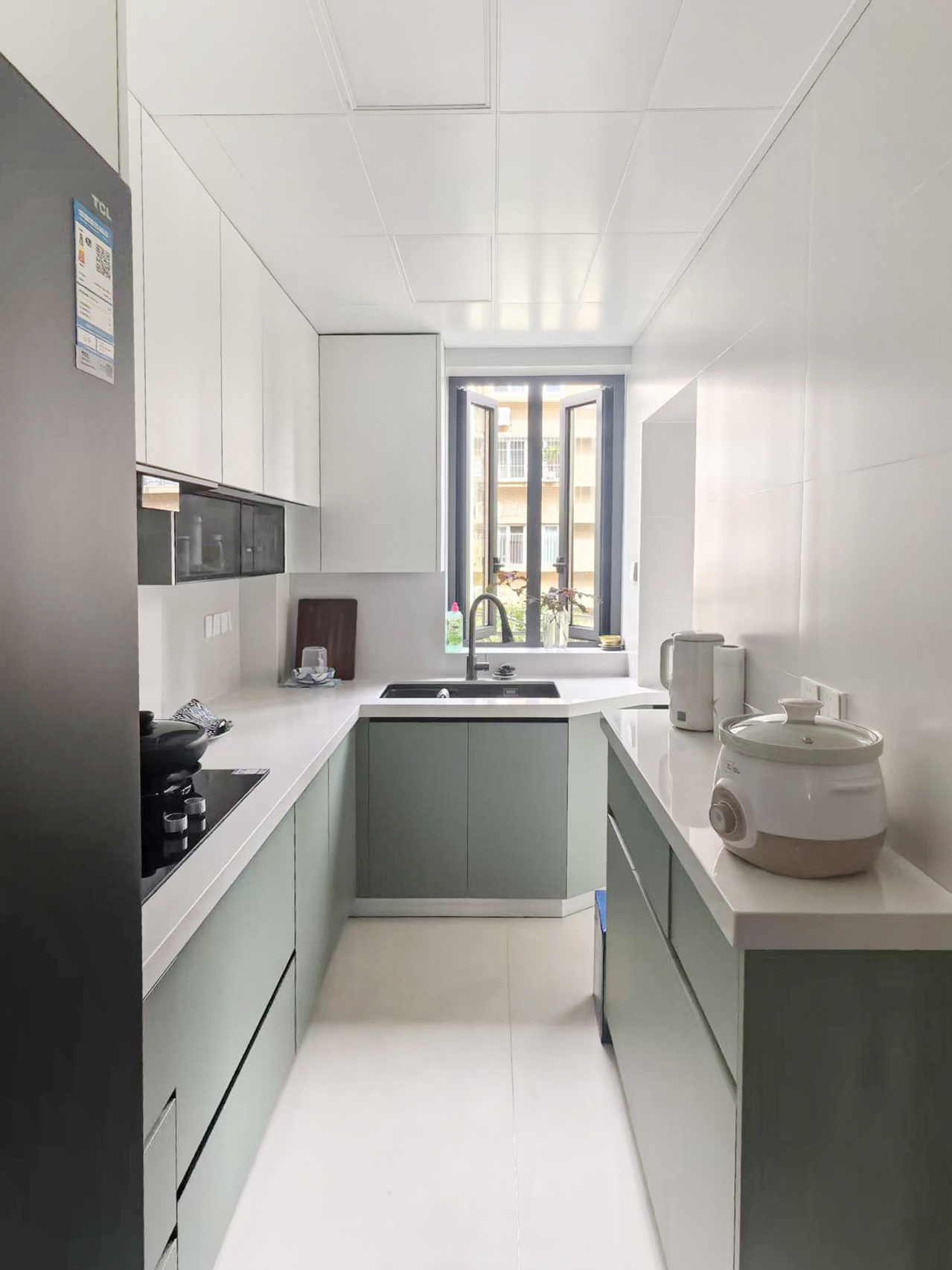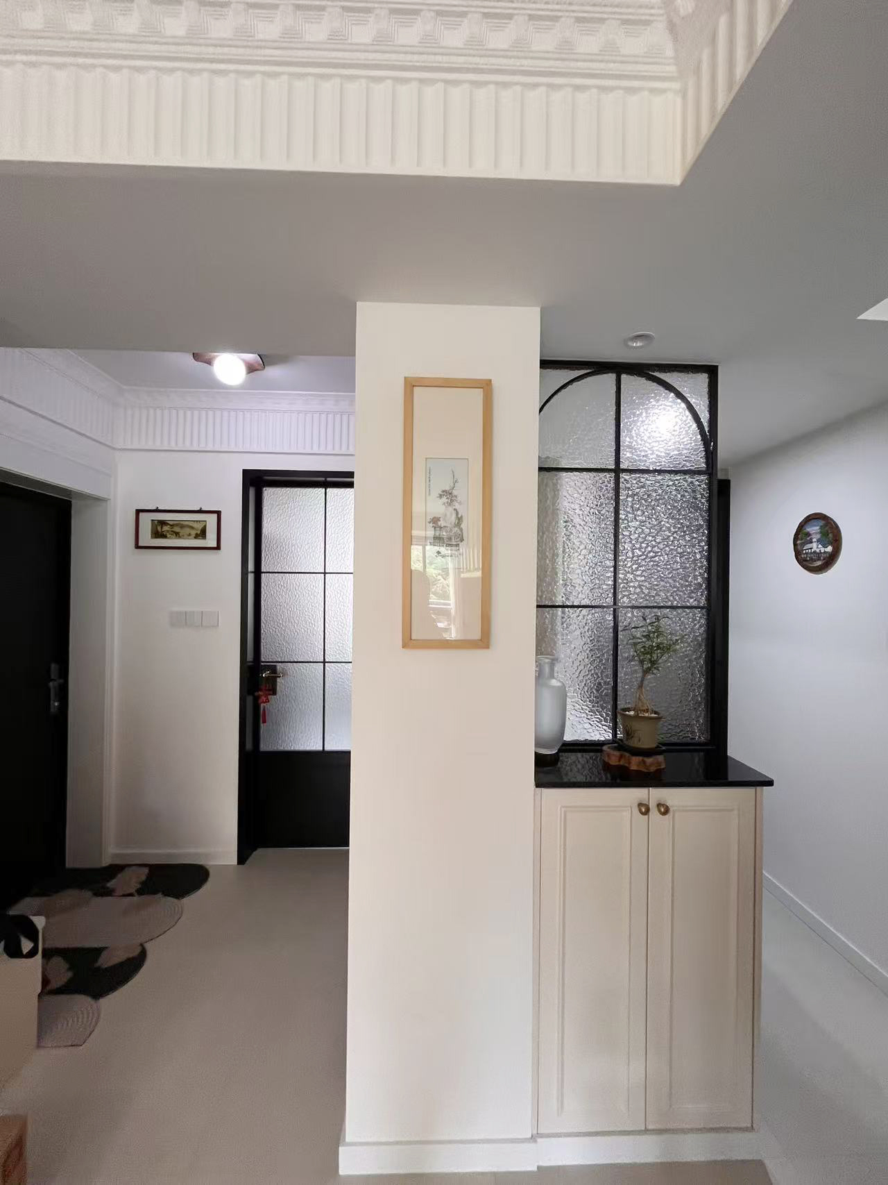 1.放大空间:复古隔断作端景,弱化客餐厅与玄关、厨卫的边界感。 2.钢琴移位盘活两面墙:释放客厅空间,整墙电视柜满足收纳+装饰+展示需求。钢琴自然划分客餐厅,营造优雅就餐氛围。 3.茶室搬进阳台:旧家具进厂涂漆翻新,和新家整体色调保持统一。 4.厨房连通工作阳台,家务区集中归置,动线优化。