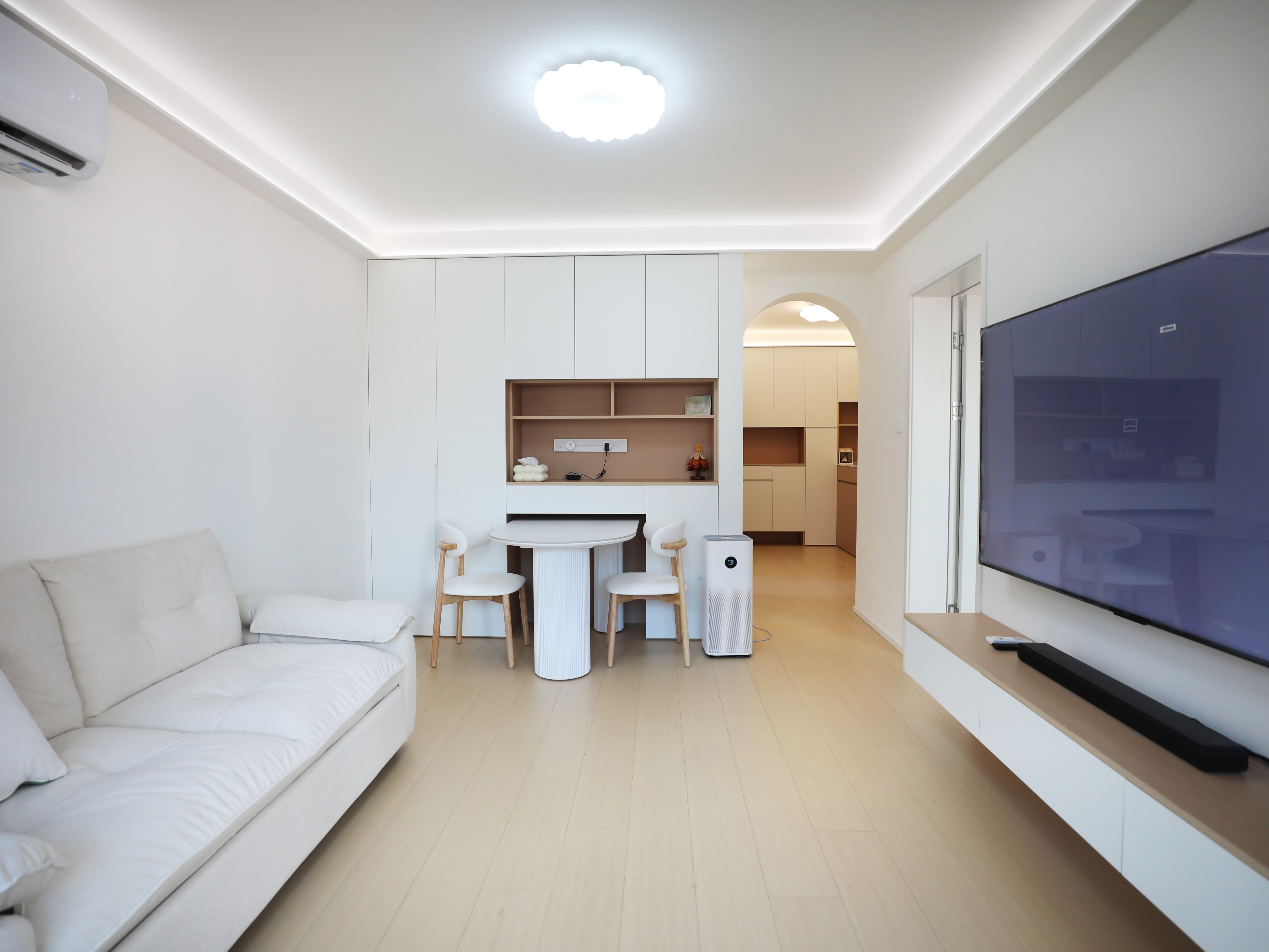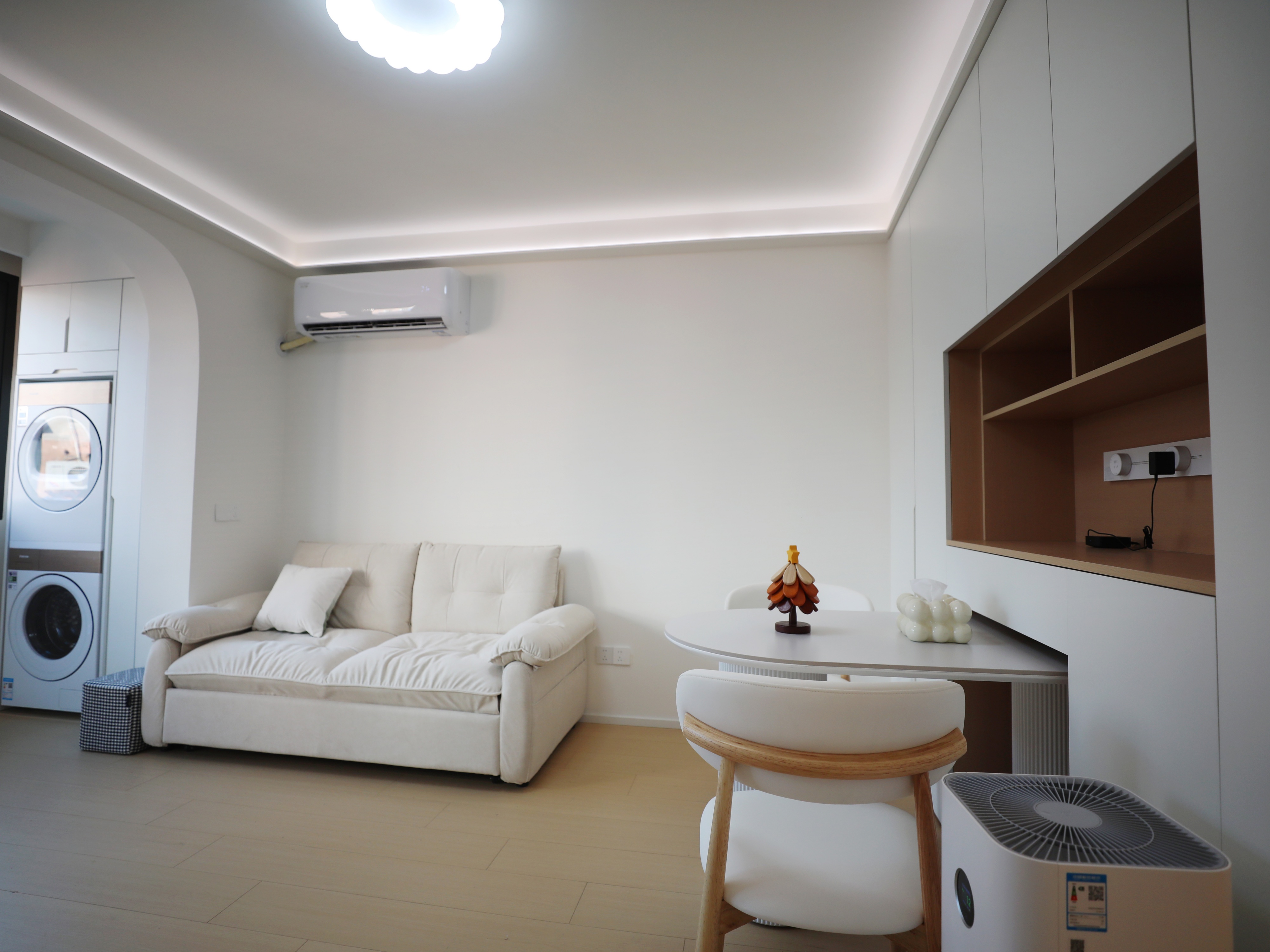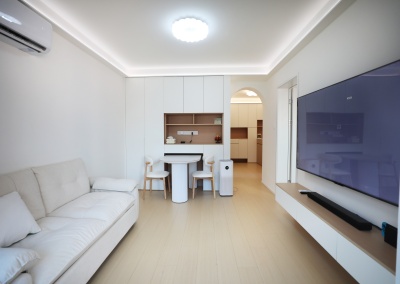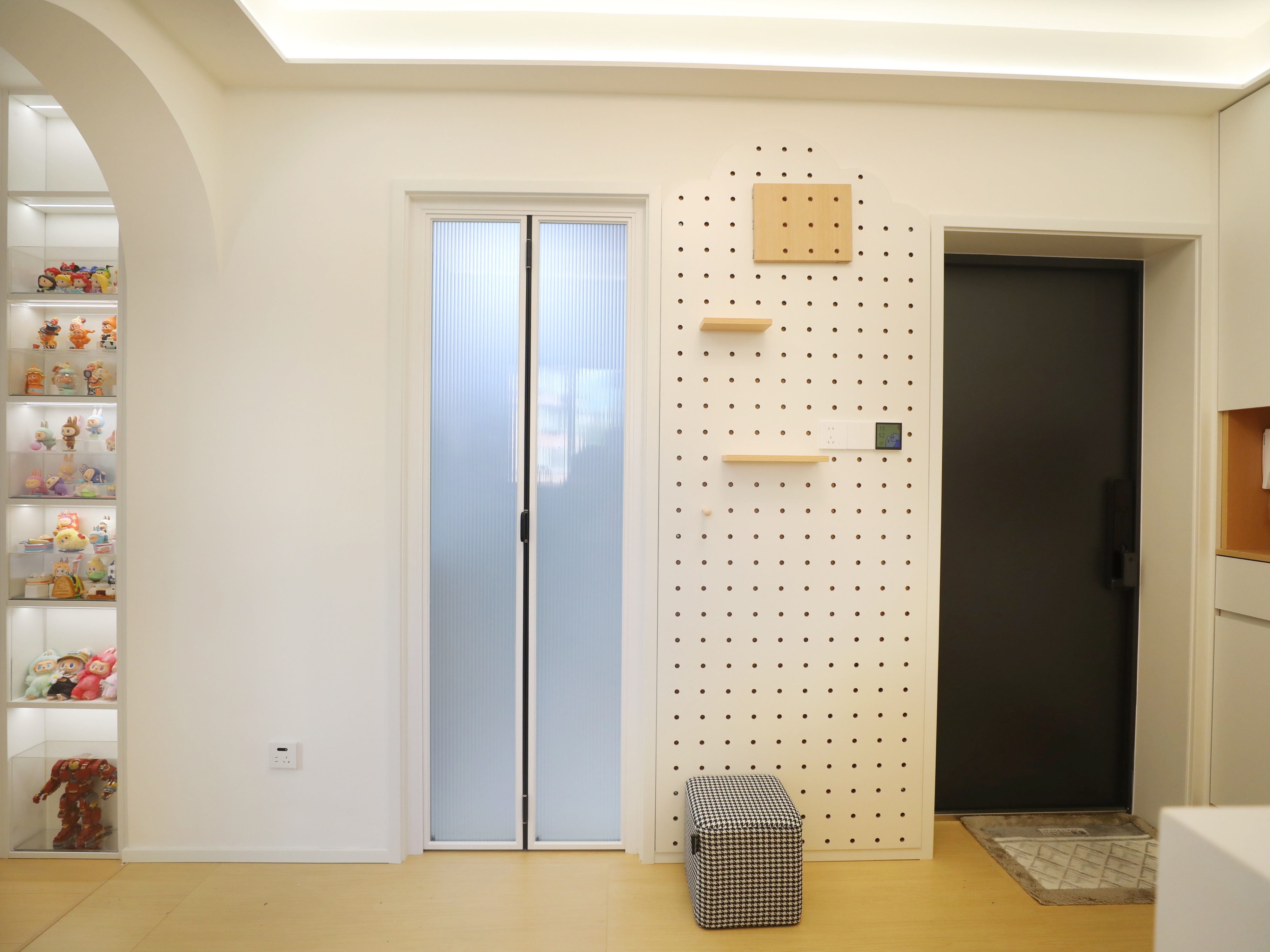 45㎡的两室户老房,无客餐厅,一条狭窄走道连通厨卫和两间卧室,通风采光不佳。王先生想要给喜爱星星人和LABUBU的未婚妻一个有爱的小家,他与同样喜欢潮玩的设计师马健丽一拍即合,通过全屋定制,打造出一个通透实用、兼顾萌宠与收藏的奶油风婚房